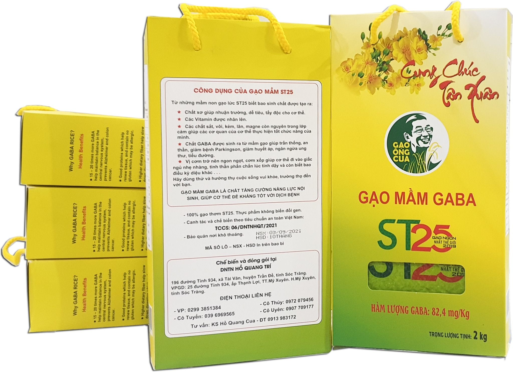 Gạo mầm Gaba ST25 Ông Cua được phát triển từ giống lúa ngon nhất thế giới ST25, sản phẩm được kỹ sư Hồ Quang Cua trực tiếp thực hiện thêm các công đoạn: ủ hạt thóc trong 22 giờ, khi hạt gạo trong hạt thóc vừa nhú mầm thì đem đi sấy khô và xay xát được gọi là gạo Gaba Ông Cua.
