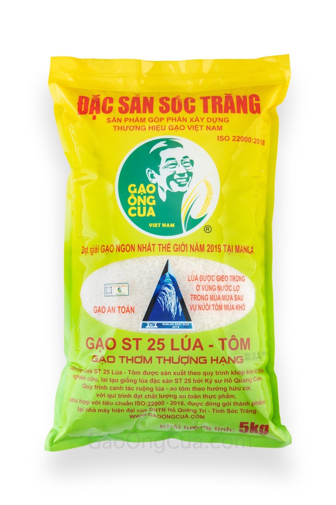 Gạo ngon ST25 Lúa Tôm Ông Cua, sản phẩm được đặt tên đúng với bản chất của sản phẩm. Gạo ngon ST25 Lúa Tôm Ông Cua được kỹ sư Hồ Quang Cua nghiên cứu và phát triển giống lúa ST25 nổi tiếng Thế giới, 2 lần liền được công nhận là gạo ngon nhất Thế Giới vào năm 2019 và 2023. Gạo ngon ST25 Lúa Tôm Ông Cua được gieo trồng 1 vụ duy nhất trong 1 năm tại vùng nước lợ vừa nuôi xong vụ Tôm, dinh dưỡng nuôi dưỡng lúa chủ yếu dựa vào dinh dưỡng của những con tôm được nuôi xong và phân bón vi sinh nên cho ra đời hạt tạo trắng tinh và thơm ngon hơn hẳn các loại gạo thông thường khác.
